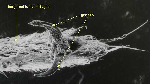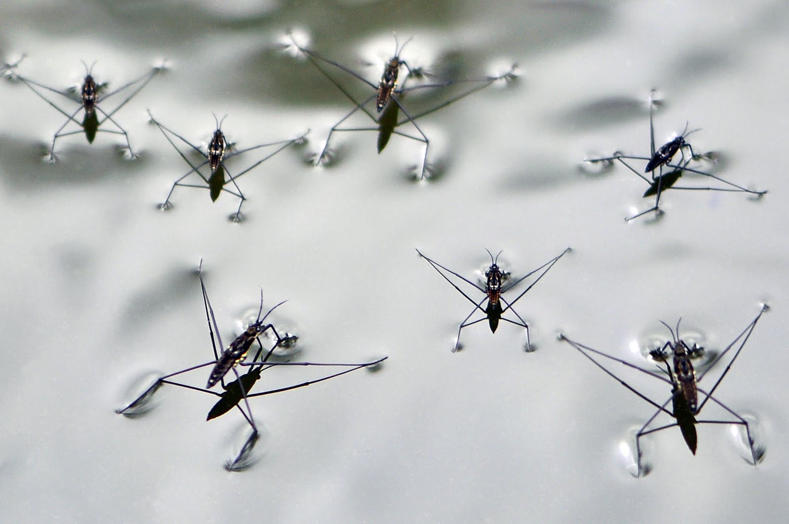 Les gerris ont des micro-poils hydrophobes sur leurs pattes qui accentuent l'effet de la tension superficielle, leur permettant de se déplacer librement sur l'eau sans couler. La tension superficielle est une force existant à l'interface entre deux milieux. Dans ce cas, c'est une tension entre un milieu solide (patte du gerris) et un milieu liquide (eau). Les molécules d'eau viennent augmenter leur cohésion sous les pattes du gerris, créant ainsi une mince pellicule pouvant supporter le poids de l'insecte à la surface de l'eau.